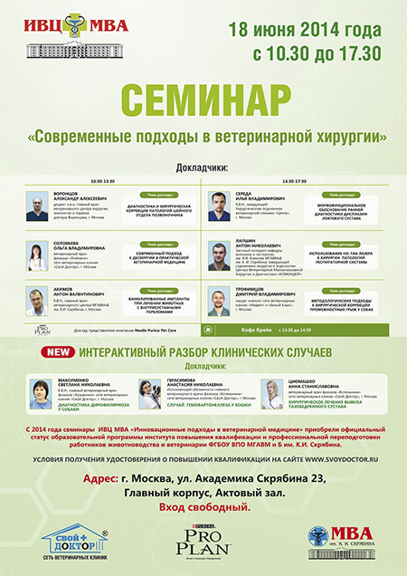 Уважаемые коллеги! Приглашаем Вас на семинар: "Современные подходы в ветеринарной хирургии" 18 июня 2014 года