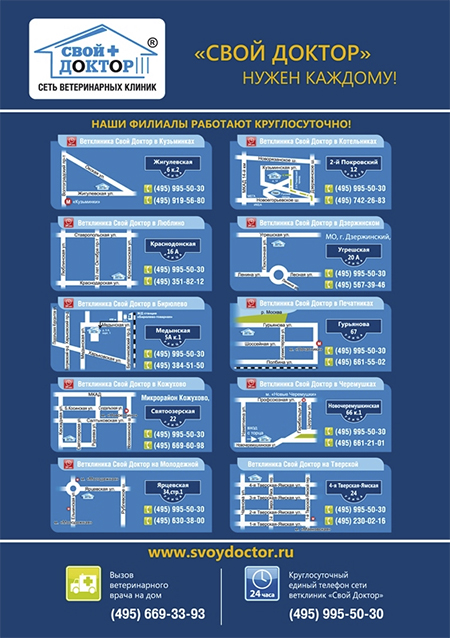 Сеть ветеринарных клиник "Свой Доктор", совместно с ведущими специалистами МГАВМиБ им. Скрябина продолжает выпускать учебно-методические пособия для ветеринарных врачей и студентов последнего курса.