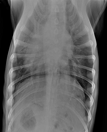 По согласованию с владельцем было принято решение сделать рентген грудной клетки в 2 проекциях и на рентгенограммах были выявлены признаки пневмонии (вероятней всего аспирационной) и бронхита (рисунок 1 и 2). Также был выполнен общий клинический анализ крови по результату которого был выявлен лейкоцитоз.