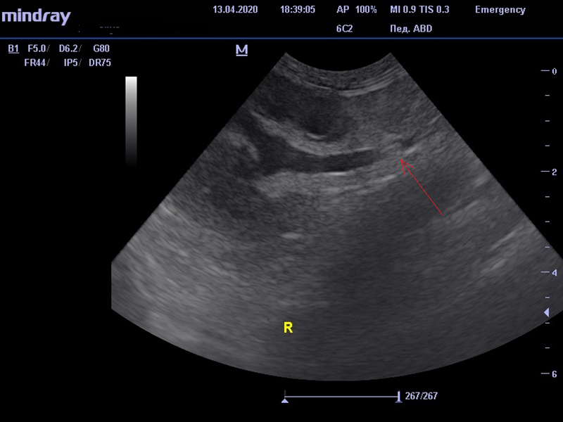 В качестве диагностики врачом было проведено ультразвуковое исследование, в результате чего было выявлено утолщение стенки мочевого пузыря, наличие осадка в мочевом пузыре. При исследовании почек отмечено повышение эхогенности мозгового слоя, а также наличие односторонней пиелоэктазии – патологического расширение лоханки почки. Мочеточник также был расширен, в его проксимальной части визуализировалась эхогенная структура, не дающая акустической тени, далее мочеточник сужался. Предполагалось, что данная структура в мочеточнике является сгустком слизи, которая может образоваться в силу бактериальной инфекции мочевыделительной системы.