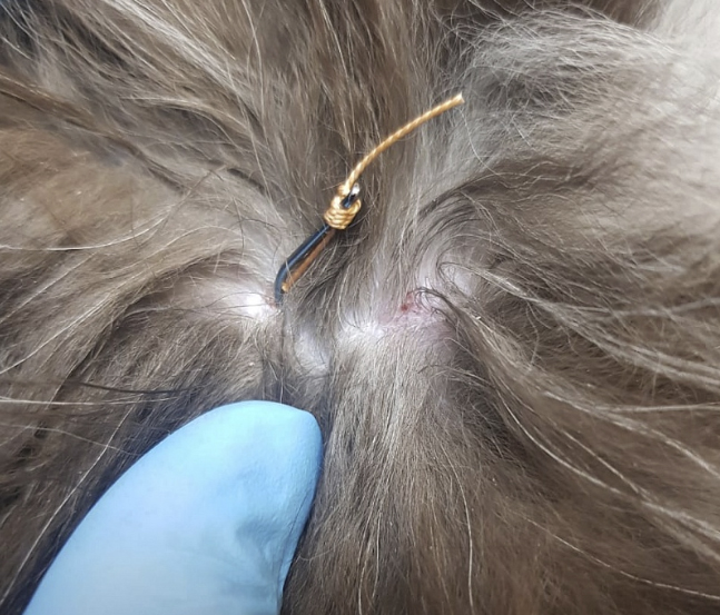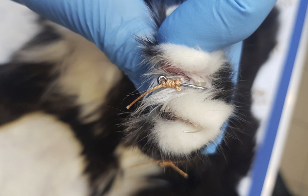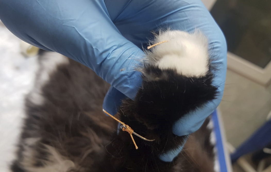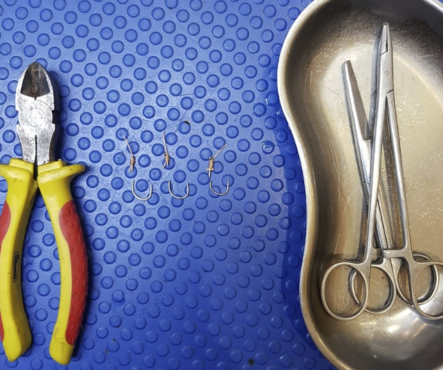 С согласия владельцев, животному была выполнена седация, обезболивание, и врач извлек все инородные предметы из кожи. Из-за наличия так называемой бородки на острие крючка, которая может дополнительно травмировать кожу при извлечении, крючки были разделены на 2 части.