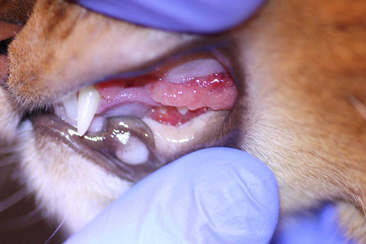 Симптоматика чаще встречается у кошек, чем собак. Десны красные, изъязвление и часто легко кровоточат. Задняя часть рта, язык и губы складки могут быть затронуты аналогичными изъязвлениями. Кошки часто перестают есть, так как из-за множественных воспалительных процессах в тканях ротовой полости (полиинфломации), процесс потребления пищи становиться очень болезненным. У кошек отмечается плохое состояние шерсти, шерсть тусклая, взъерошенная, зачастую сальная. Кошки апатичны, вялые и не активные. У кошки обильно и часто выделяется слюна и ощущается неприятный запах изо рта.